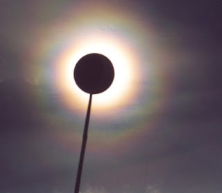 - The small and uniform rain drops from the convection result in coloured diffraction rings. The central bright area slightly enlarged is the sun.
